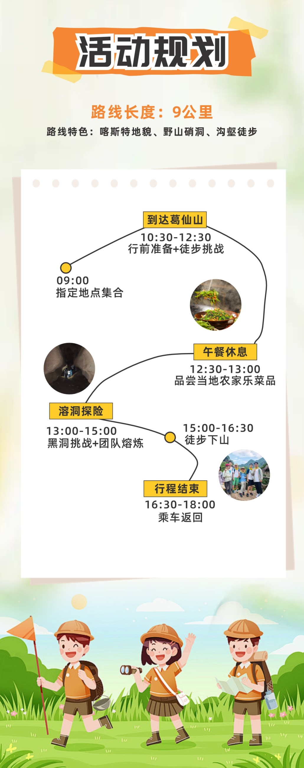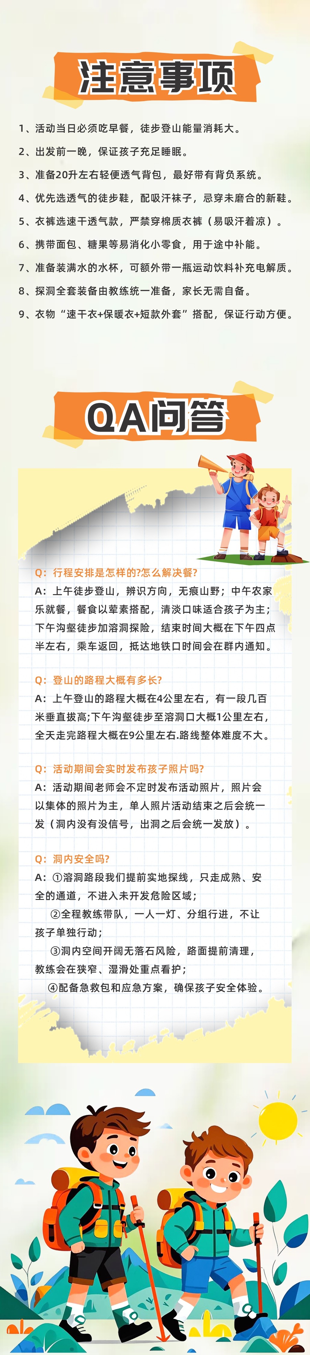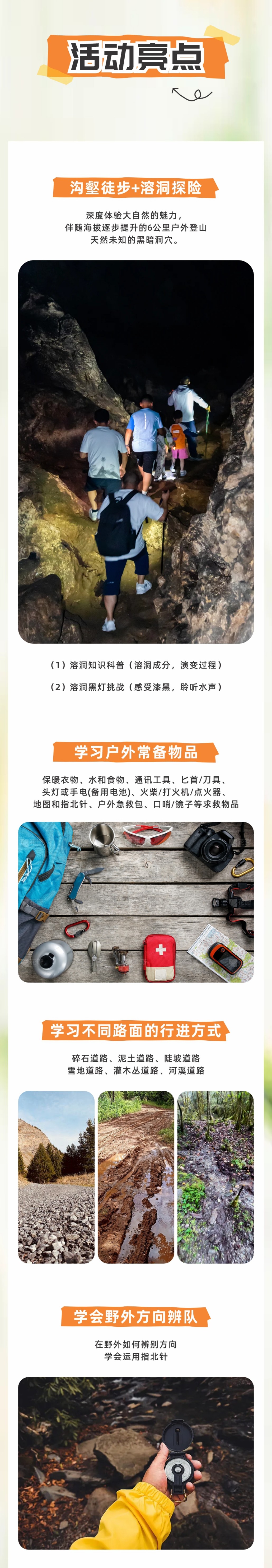 答:上午徒步登山,辨识方向,无痕山野;中午农家乐就餐,餐食以荤素搭配,清淡口味适合孩子为主;下午沟壑徒步加溶洞探险,结束时间大概在下午四点半左右,乘车返回,抵达地铁口时间教练会在群内通知。