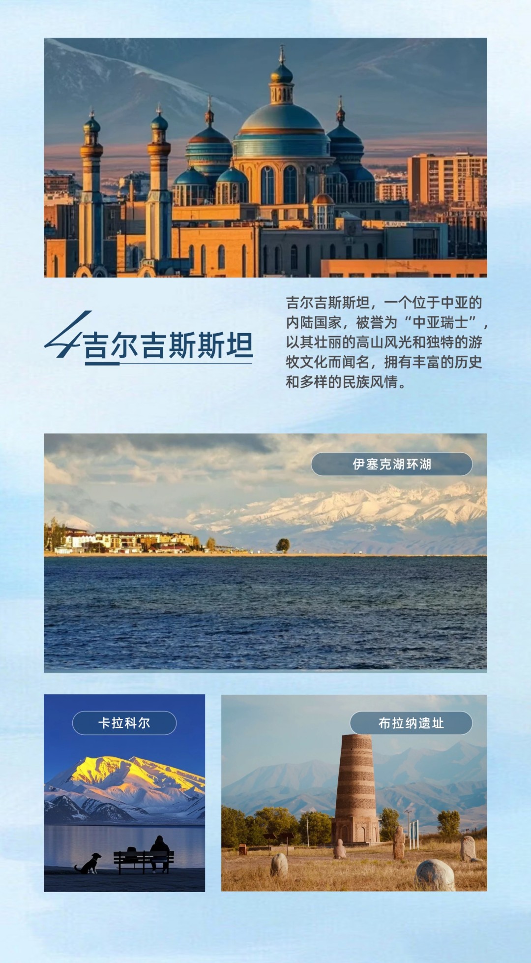 - DAY4:伊塞克湖→天山峡谷→卡拉库尔 前往湖东端的卡拉库尔,探秘杰蒂奥古兹峡谷(七牛峡谷)与童话般的斯卡尔卡峡谷,感受天山山脉的鬼斧神工;在市区参观独特的东干清真寺与俄罗斯东正教堂,感受多元文化的交融。