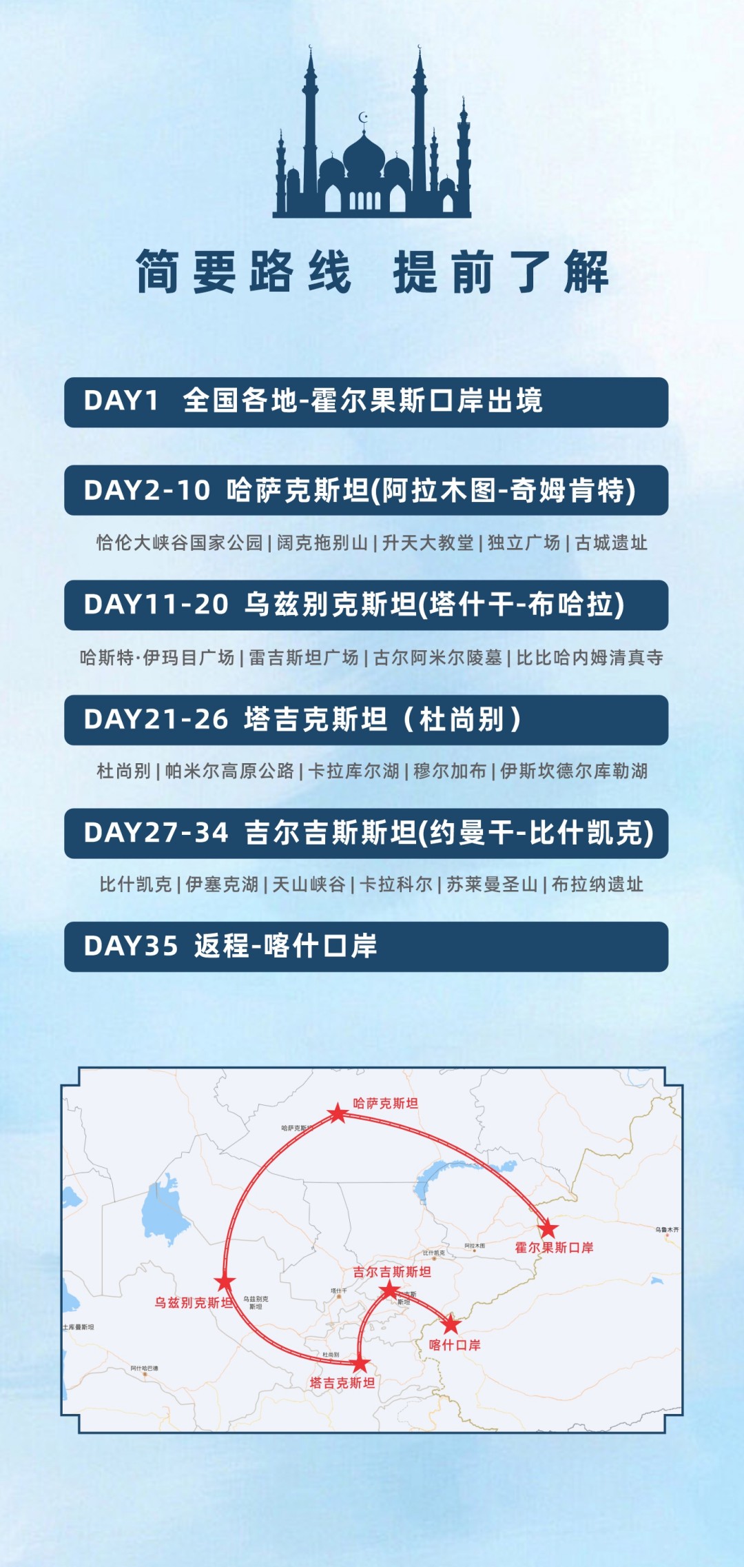 历经35天的跨境探索,从中亚的壮阔风光、千年文明中满载回忆,在喀什口岸完成入境手续,结束这段难忘的四国秘境之旅。
