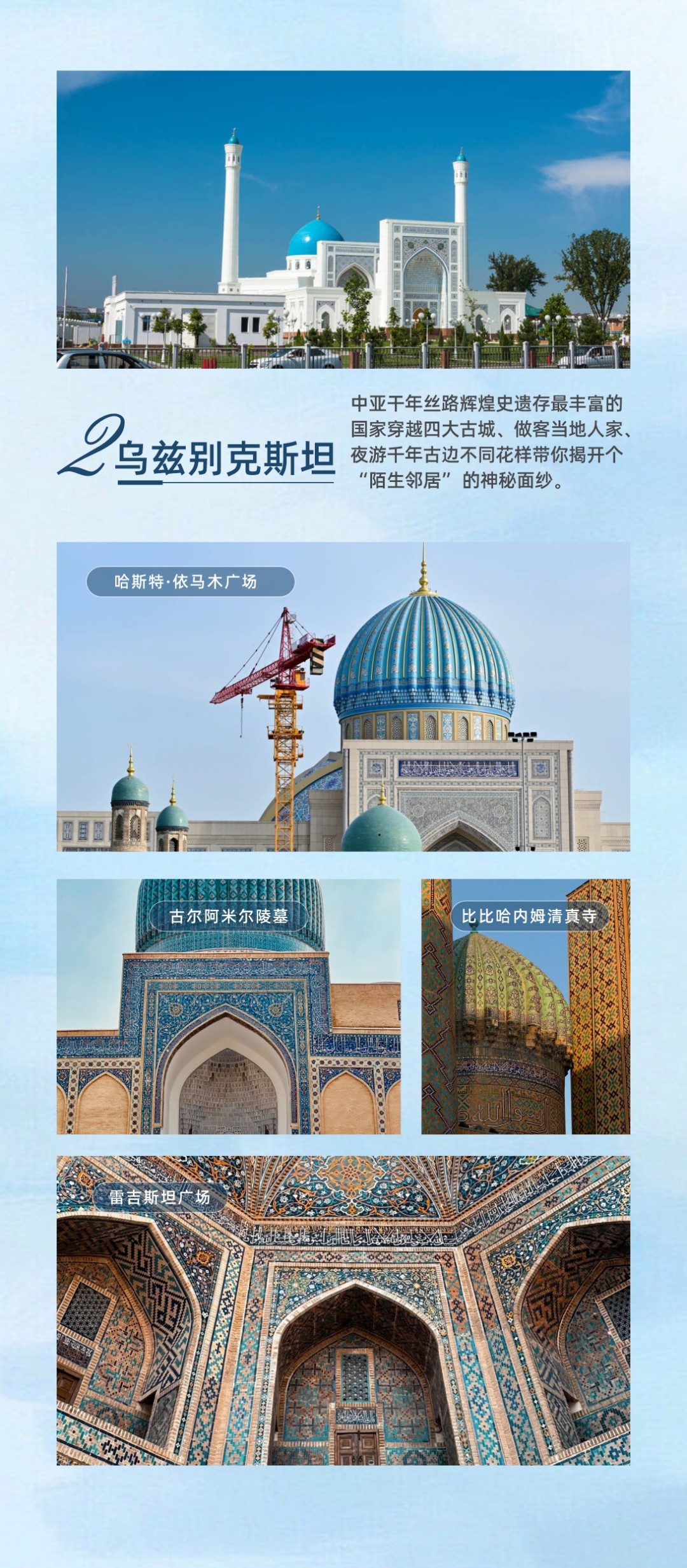 从塔什干到撒马尔罕、布哈拉,踏入帖木儿帝国的辉煌旧梦,在蓝色瓷砖装点的建筑群落中,解锁中亚文明的璀璨密码。